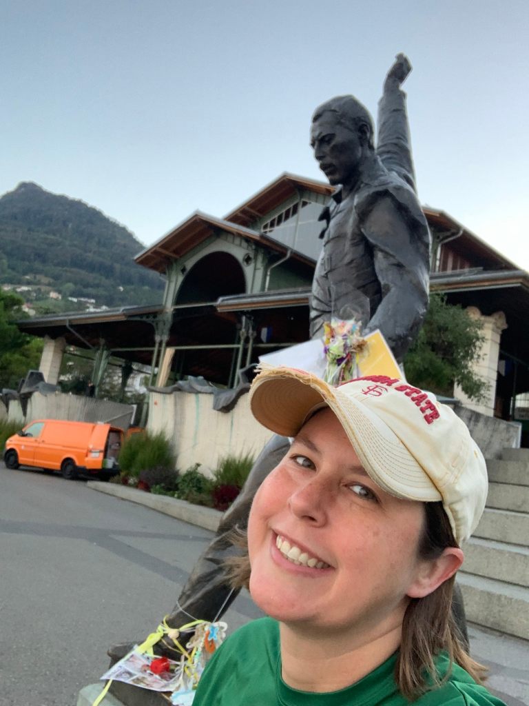 Friends, please excuse the radio silence on these pages for the past couple of weeks. LeeLee and I took to the air to visit several cities/countries in Europe, where my formal training was lacking but our walking mileage went WAY up! The trip was just what the doctor ordered for both mental enrichment and mental health. And I did get some running in; for instance, here I am on a morning jaunt in Montreux, Switzerland, posing with the statue of my beloved Freddie Mercury.